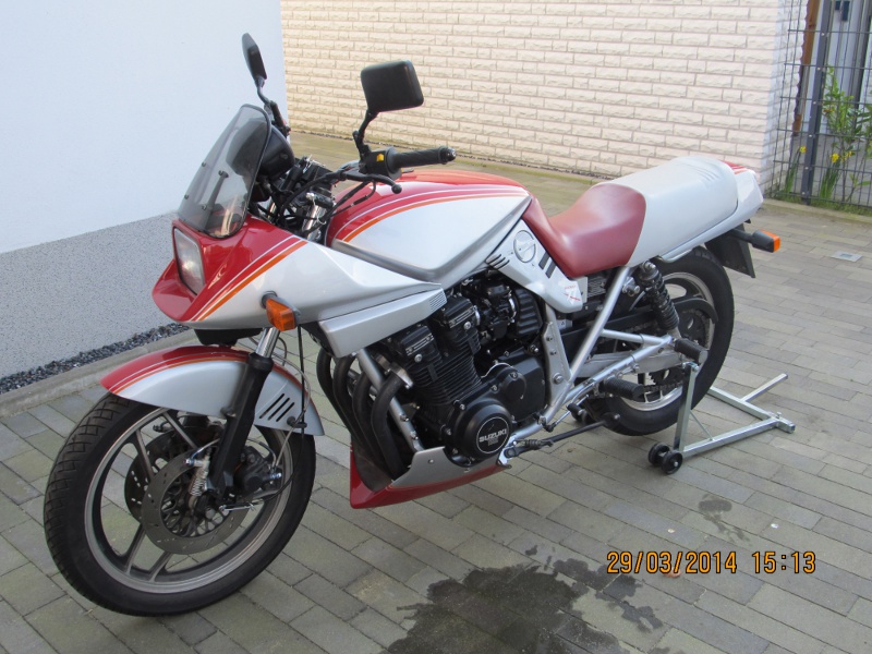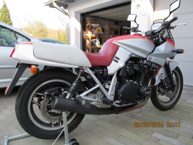 Sehr schöne Auslandsversion, die sah ich, allerdings in der blauen Variante, das mal erste live und in Farbe 1988 in Spanien... schön, kommen da noch SUZUKI Schriftzüge auf den Tank, oder lässt Du es so?