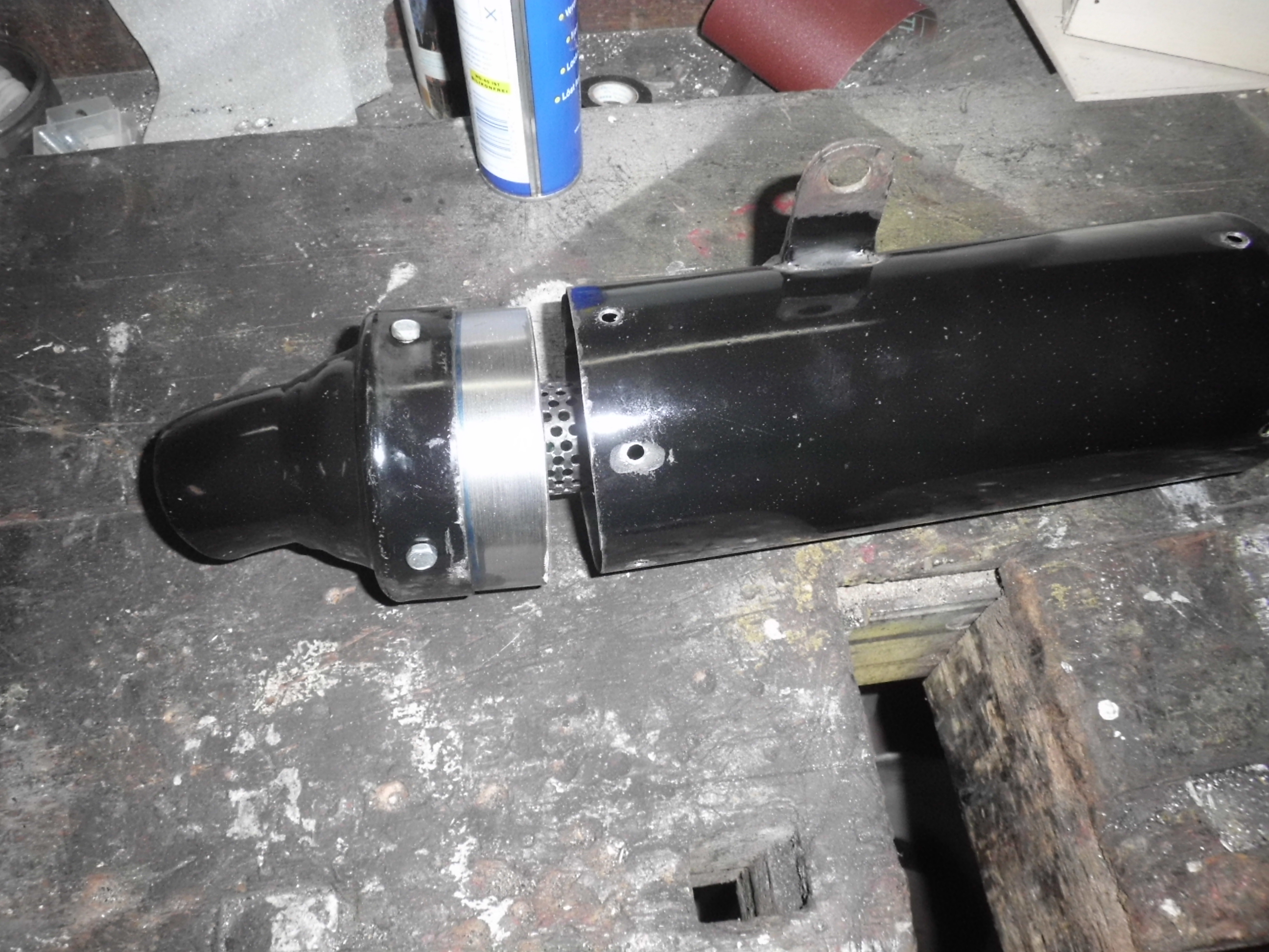 Deshalb habe ich mir kurzerhand einen passenden Ring gedreht, der innen in den Endtopf reinkommt, an der Endkappe wird der mit dem goldenen Blech zusammen vernietet uUnd am Endrohr durch neu gebohrte Löcher verschweißt ... Dann mit den Dämmmatten von Tante Louise alles umwickelt und das Paket mit etwas Draht gesichert ... Alles wieder in den Endtopf gesteckt und wieder schön vernietet ...