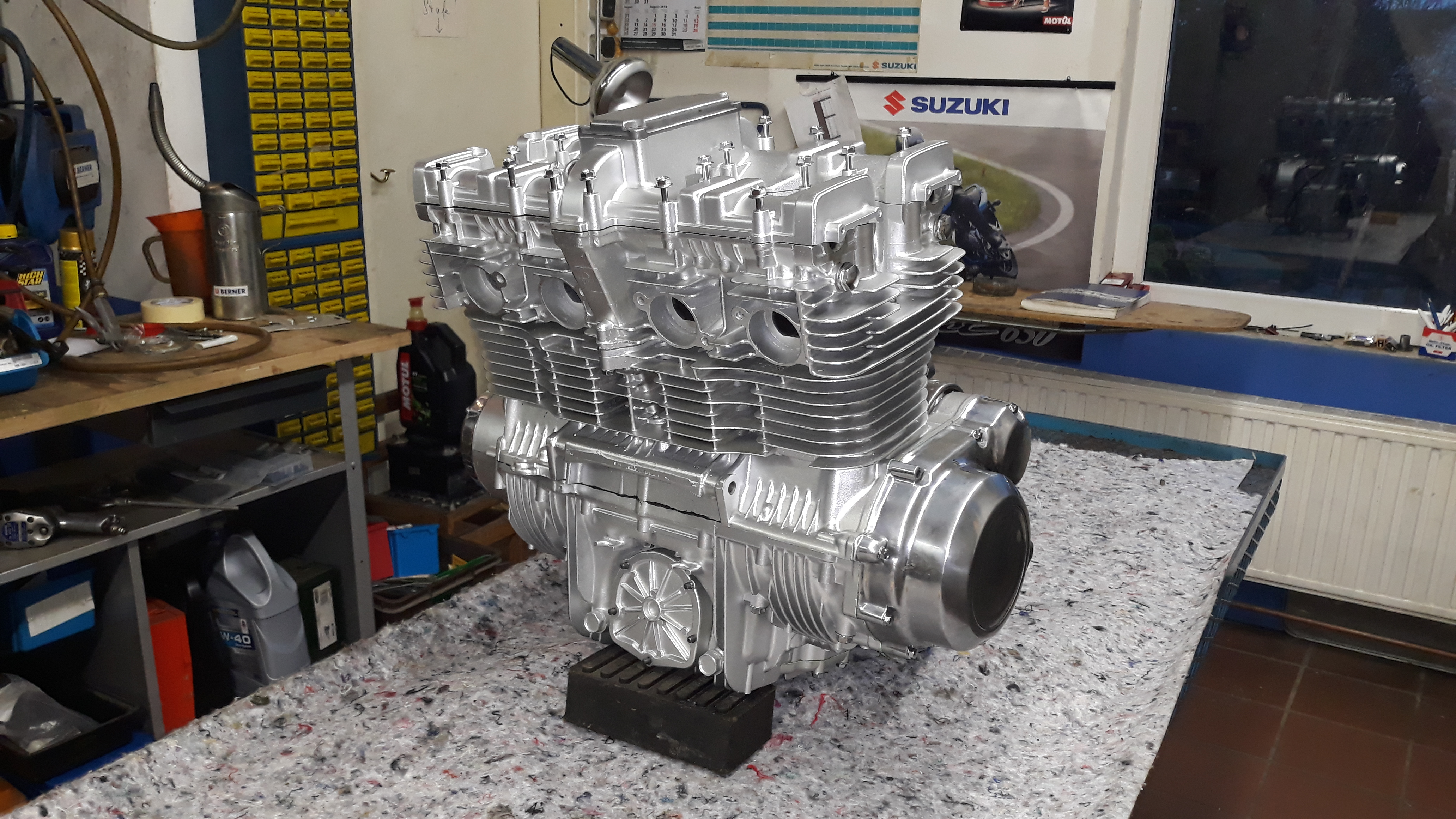 Neue Kolben, Kurbelwelle wuchten, Zylinder planen, alles strahlen und lackieren.