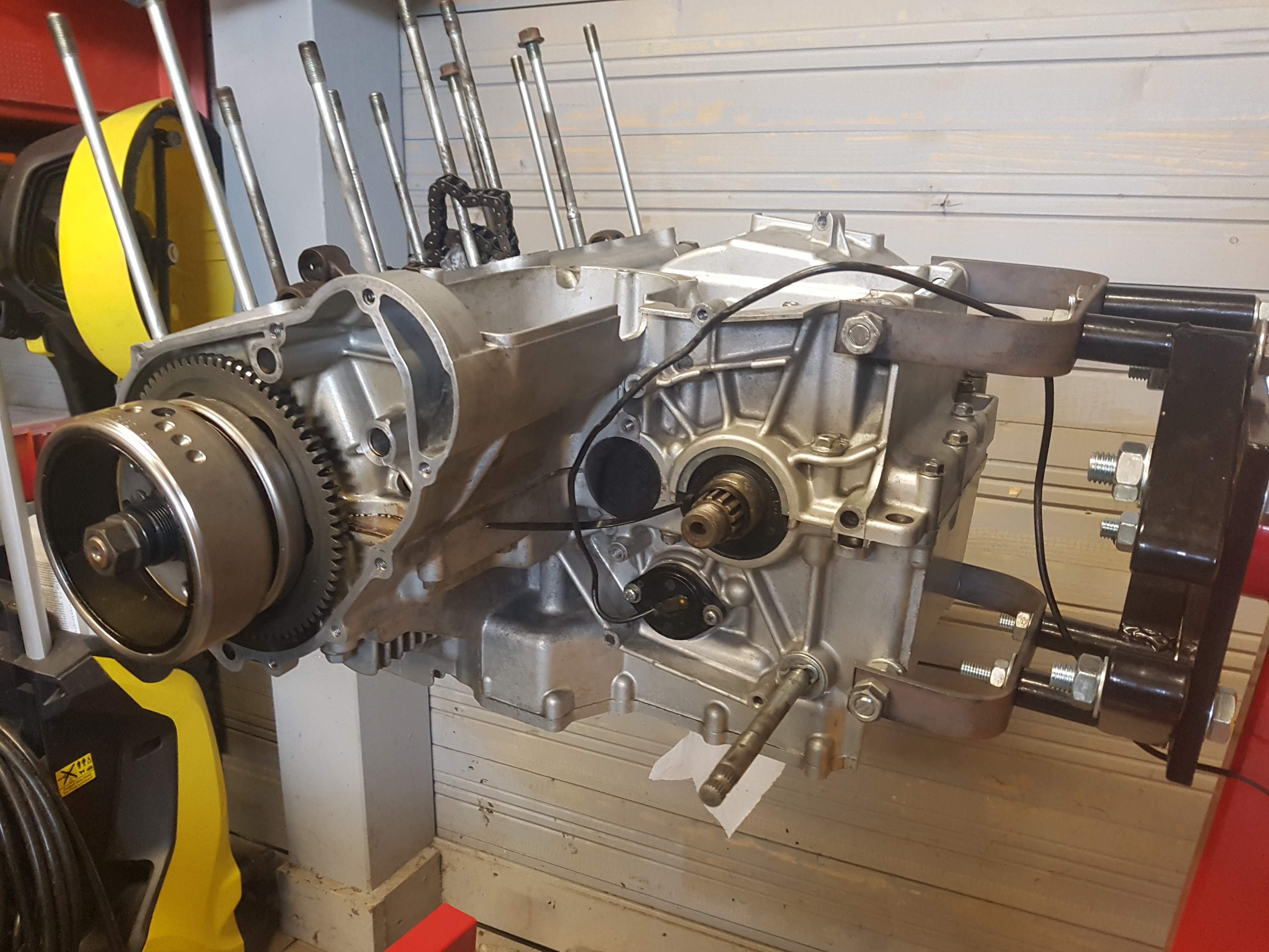 ich habe mal begonnen die Vorbereitungen für den Neuaufbau eines 11er Motors zu machen. Zerlegt ist er schon und ich habe das komplette Motorgehäuse schon mal sauber gemacht. Gefühlte 20 Dosen Bremsenreiniger später das Ergebnis.