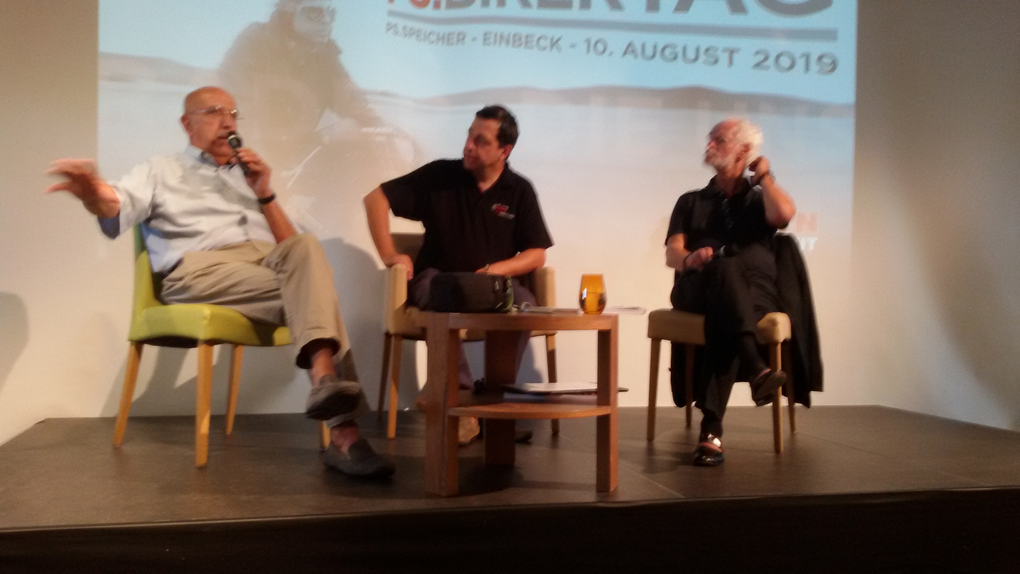 an diesem Wochenende fand der Bikerday am PS.Speicher in Einbeck statt, als Gastredner zur italienischen Motorradentwicklung waren Seniore Laverda (blaues Hemd) und Hans A. Muth (der Designer unserer Katana) geladen. Ich habe die Gelegenheit genutzt und Herrn Muth ein kleines Treffen aufgeschwallert!