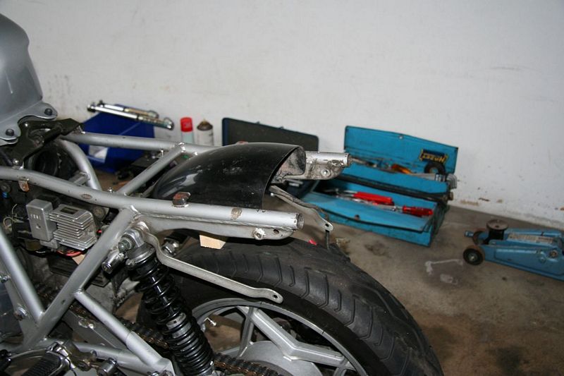 Die originale Radabdeckung habe ich so gekürzt, dass die mit den beiden hinteren Befestigungslöchern an die Gewindelöcher ans Rahmenheck passt und verschraubt werden kann.