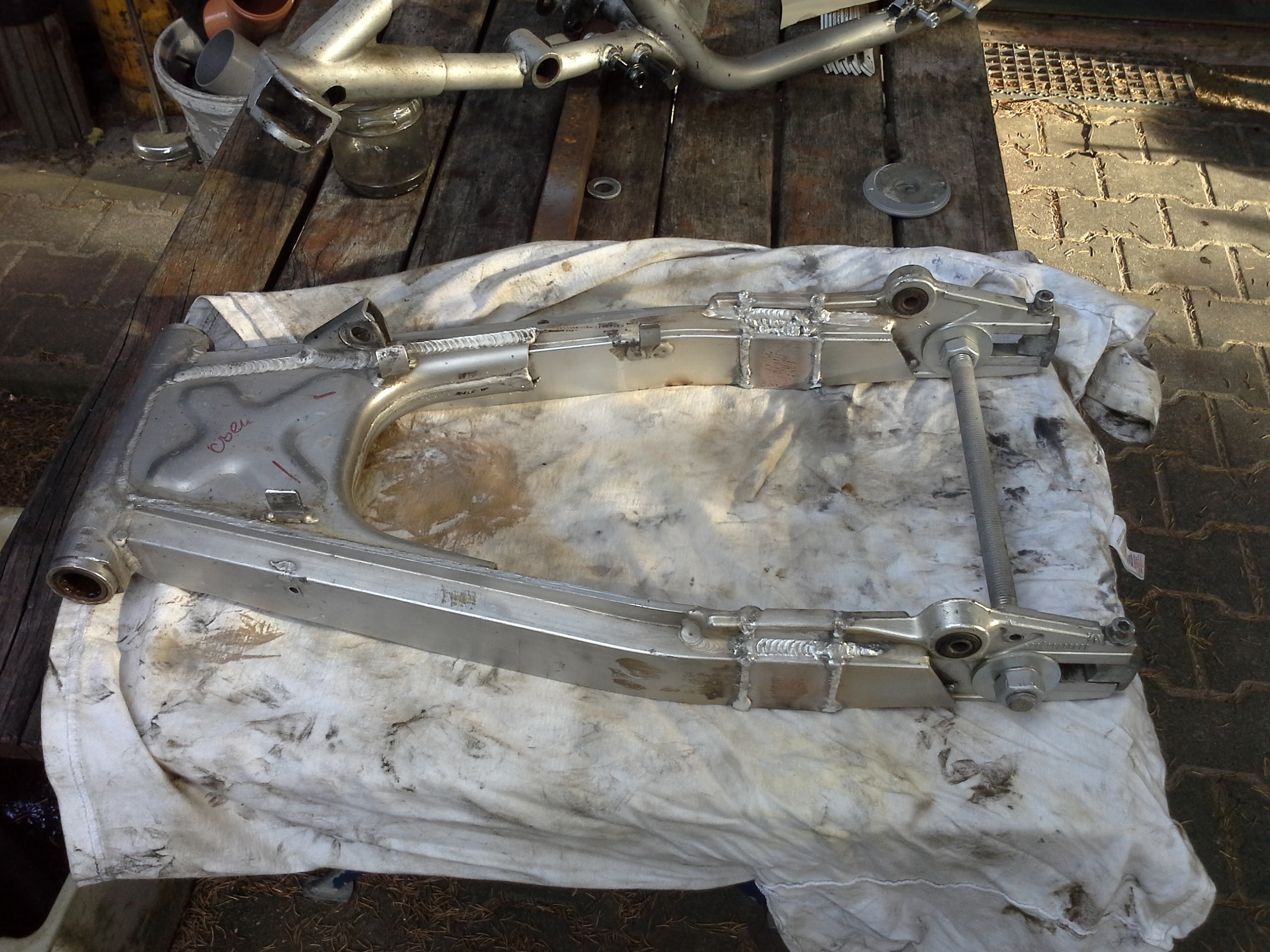 Es geht weiter, habe heute das Innenleben der R-Schwinge von ihrem Korpus befreit. Das hat ne ganze Stunde gedauert. Das bisschen Aluminium .Aber zumindest weiß ich jetzt, wo die Schwinge überall gehoften und nicht durch gängig verschweißt war. War ich etwas überrasch. Da war das Raustrennen des Alu's an der Katana schwinge eher lächerlich. Werde mich jetzt Step by Step vorarbeiten, bis es passt. Hab ja vorher alle Maße übernommen und aufs Papier gebracht .So, noch ein paar Aufnahmen