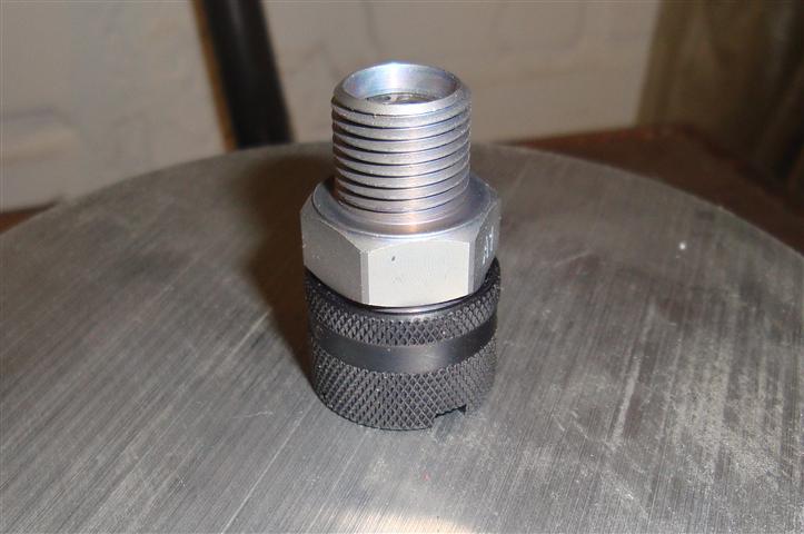 Mit diesem kleinen Griffstück mit Bajonettmimik und angebautem Silikonschlauch kann man jetzt mit der schlanken Vierteldrehung das Kugelventil öffnen und das Öl fließt über den Schlauch dahin, wo es soll, und nicht über die Pfoten.
