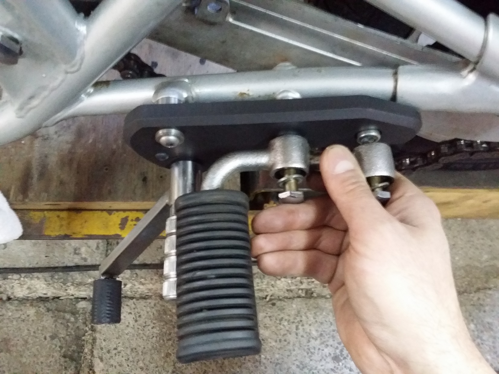 Bestehen aus 15 mm Aluplatten, GS 550 Katana Bremshebel (umgeschweißt), Gimbel Schalthebel, Schaltgestänge mit Gelenkköpfen, 28 mm Alufußrasten mit Aufnahmebolzen