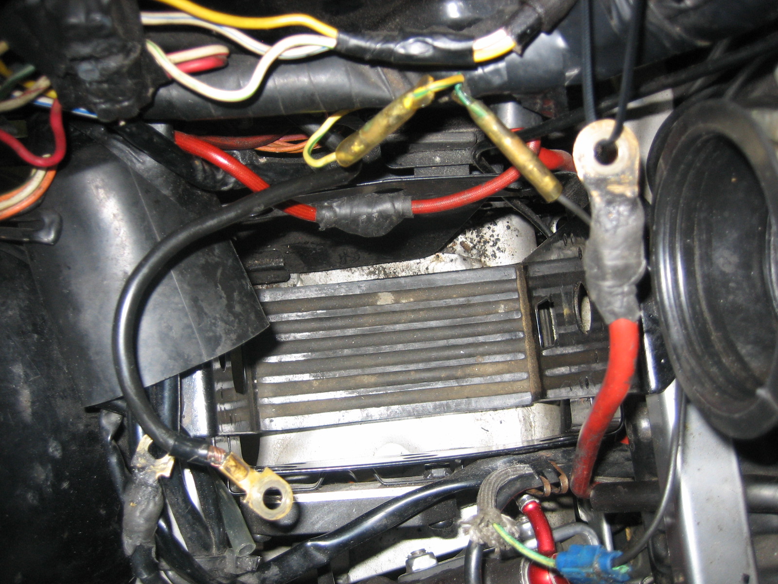 Bei der 1. 750iger geht seltsamerweise nur ein dickes rotes Kabel vermutlich zum Anlasserrelais. Wo das rote Kabel vom Regler hingeht, kann ich nicht ohne weiteres sehen. Das verstehe ich nicht. Wie wird die Batterie der 1. 750iger von der Lichtmaschine über den Regler geladen, wenn das rote Kabel des Reglers nicht mit dem Pluspol der Batterie verbunden ist?