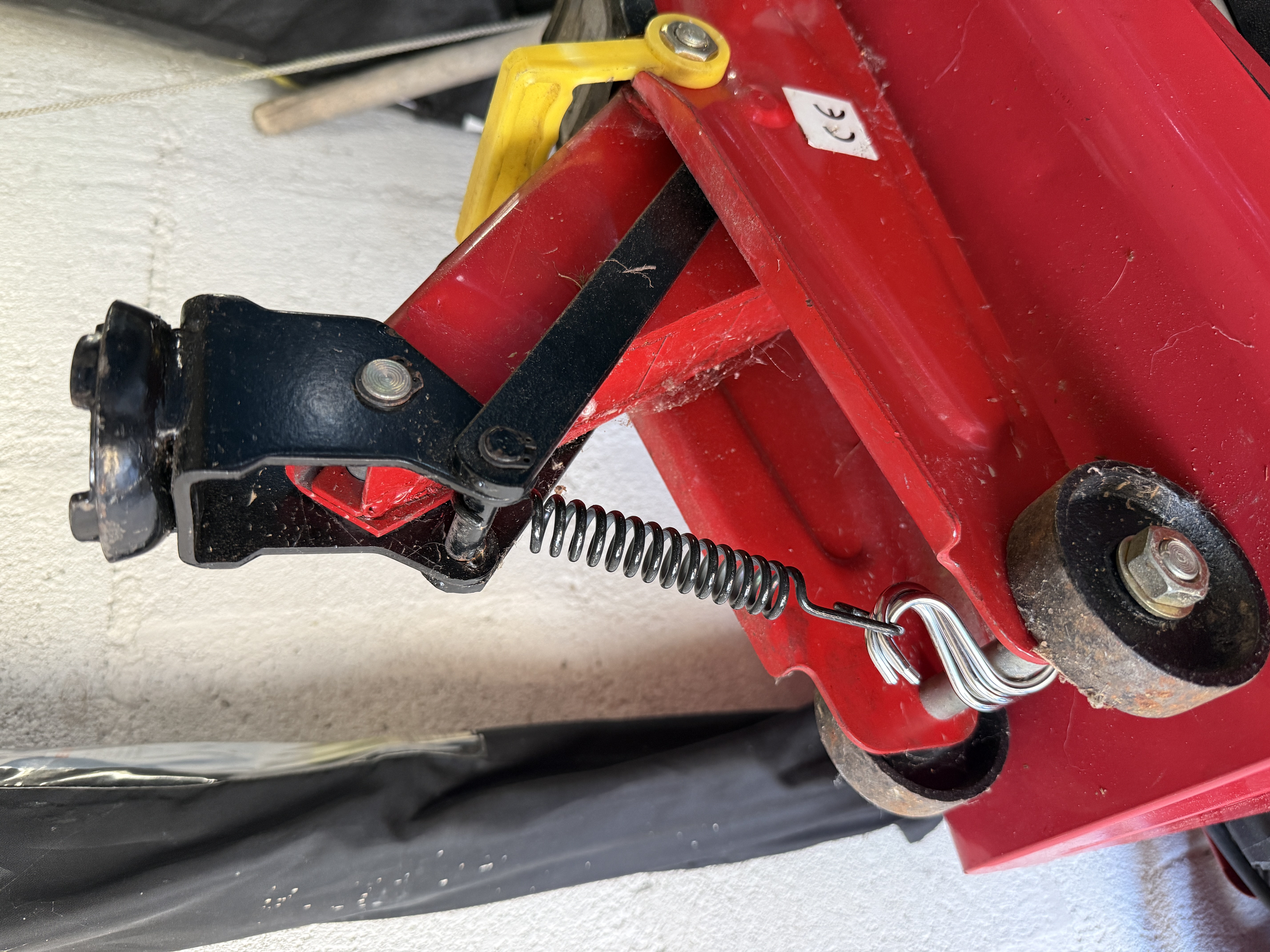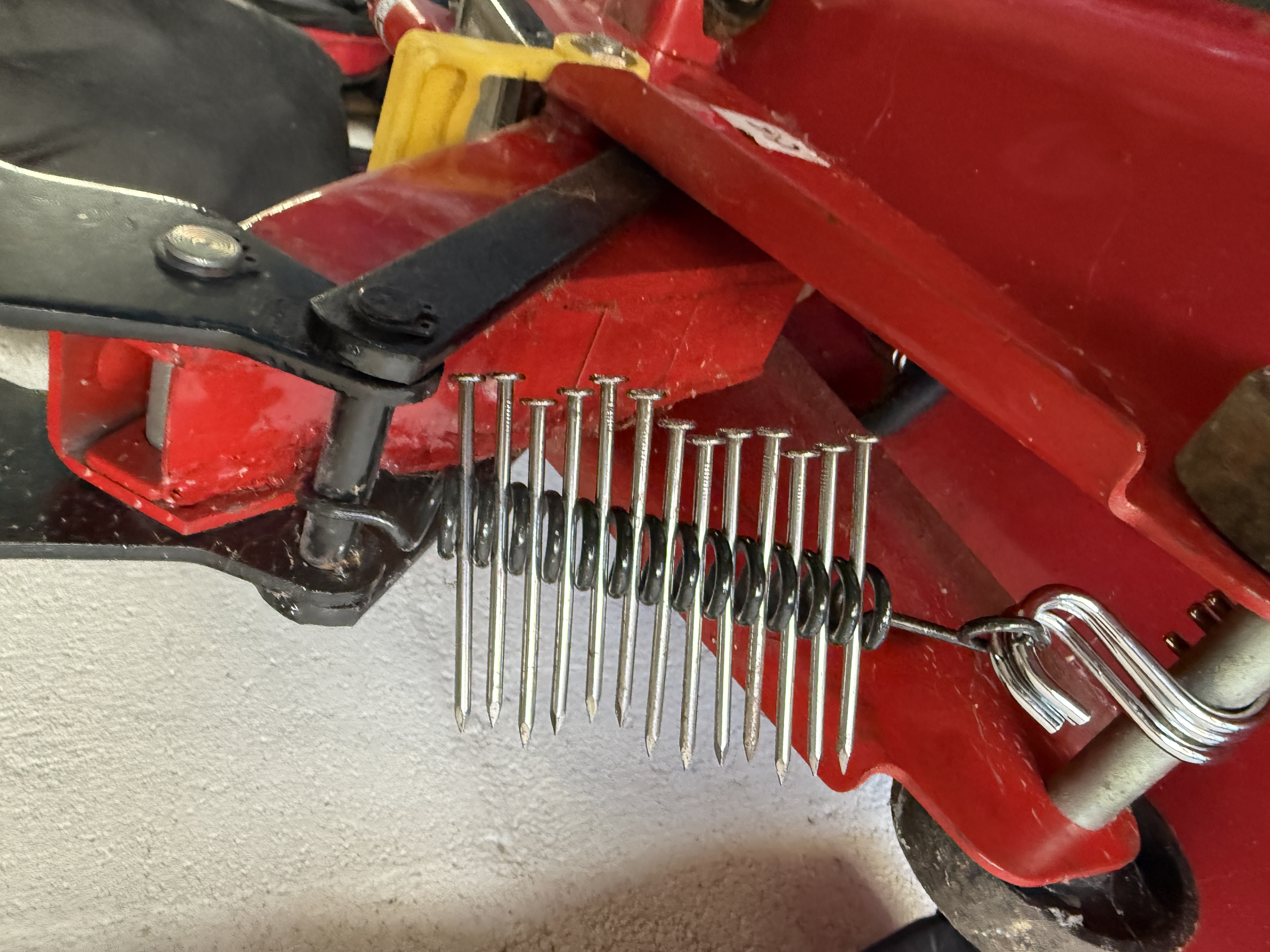 und es ordentlich Kraft braucht die Feder auseinander zu ziehen konnte ich endlich mal wieder den Wagenheber zum Einsatz bringen. Oben ließ sich die Feder direkt einhängen und unten habe ich drei Haken genommen denn bei einem hatte ich die Befürchtung, dass es Ihn aufbiegen könnte. Anstelle der im Netz vorgeschlagenen Beilegscheiben /Sprengringe (Bild 2) habe ich dann Nägel genommen (da hatte ich genügend) und das zudem einfacher war als mit den Beilegscheiben. Sie ließen sich dann mit einer Zange auch einfach wieder rausziehen. Man muss sie nur so reinschieben, dass sie beim Einhängen dann nicht im Weg sind.