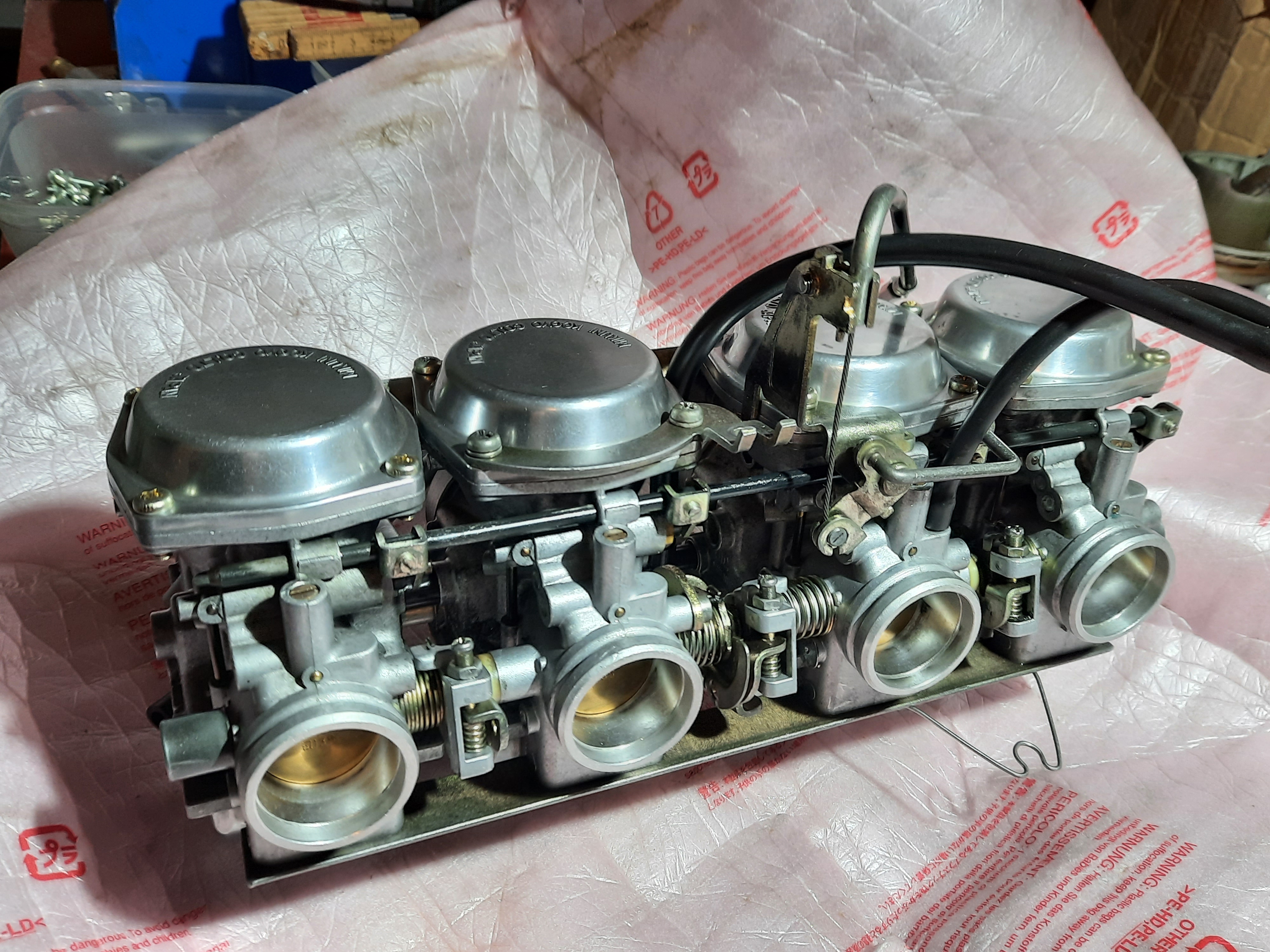 habe die Vergaser komplett überholt: und die Bremsanlage: diese Woche werden noch die Reifen montiert, und dann steht Sie endlich wieder auf eigenen "Füßen"!
