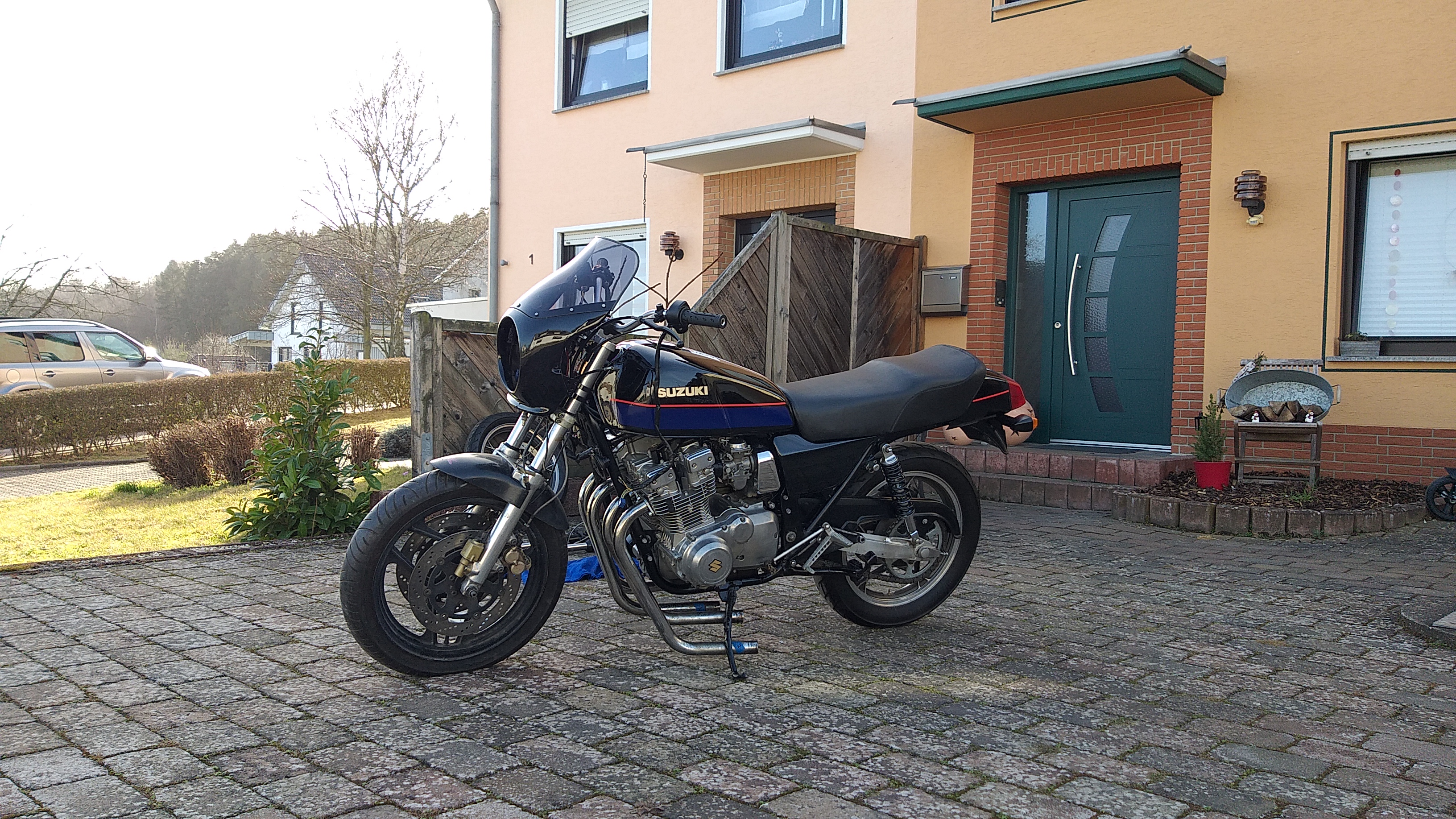 Die Basis ist eine GSX750E in einem sehr guten Zustand. Die 89 Tsd. Km. sieht man ihr nicht an. Die letzten 20 Jahre verbrachte sie gut konserviert in einem Wohnzimmer. Nach dem Tod des Besitzers, wurde die Sammlung von Klaus Hülsmann gekauft. Da er nur die schöne 6 Zylinder CBX1000 wollte wurden alle anderen Bikes verkauft.