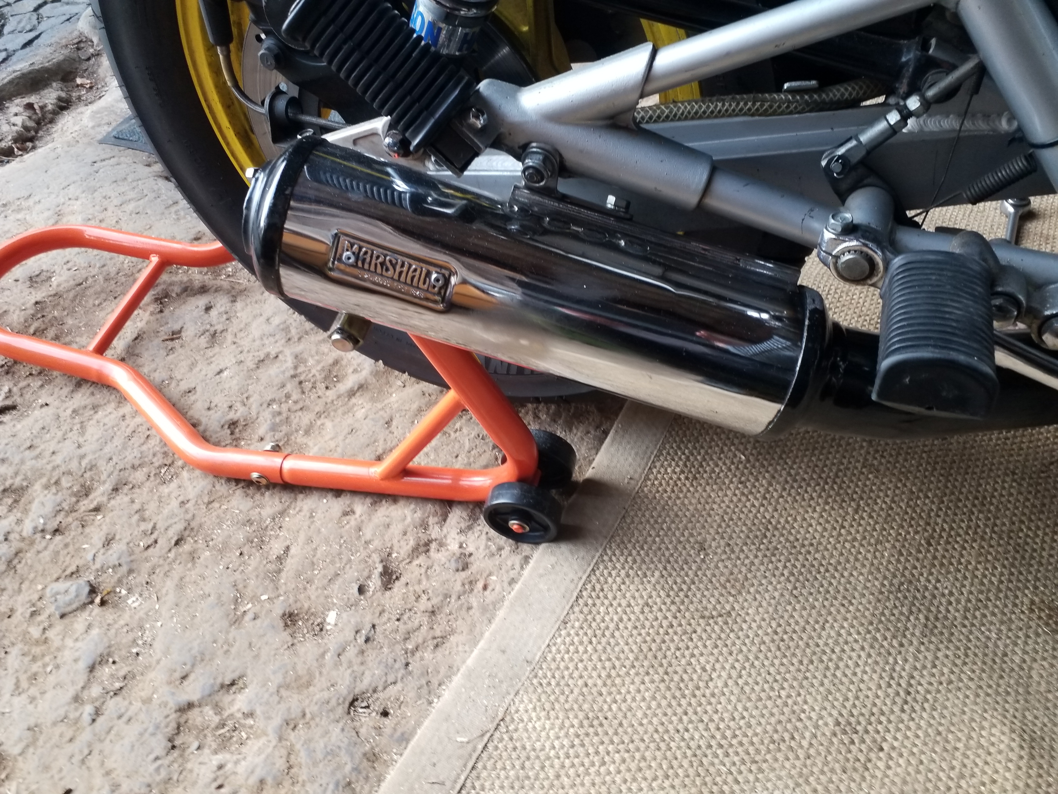 das Speer-und Gimbelmaterial ist jetzt runter, wenn jemand Interesse daran hat, kann sich gerne melden. Schön gelbe Originalfelgen sind jetzt auch über. Der Marshall-Auspuff, bin noch nicht sicher, ob er bleibt, die Originalanlage und den Hauptständer habe ich ja auch, ebenso die Originalfederbeine. Hagon-Federbeine sind jetzt verbaut, aber fast so alt, wie die originalen.