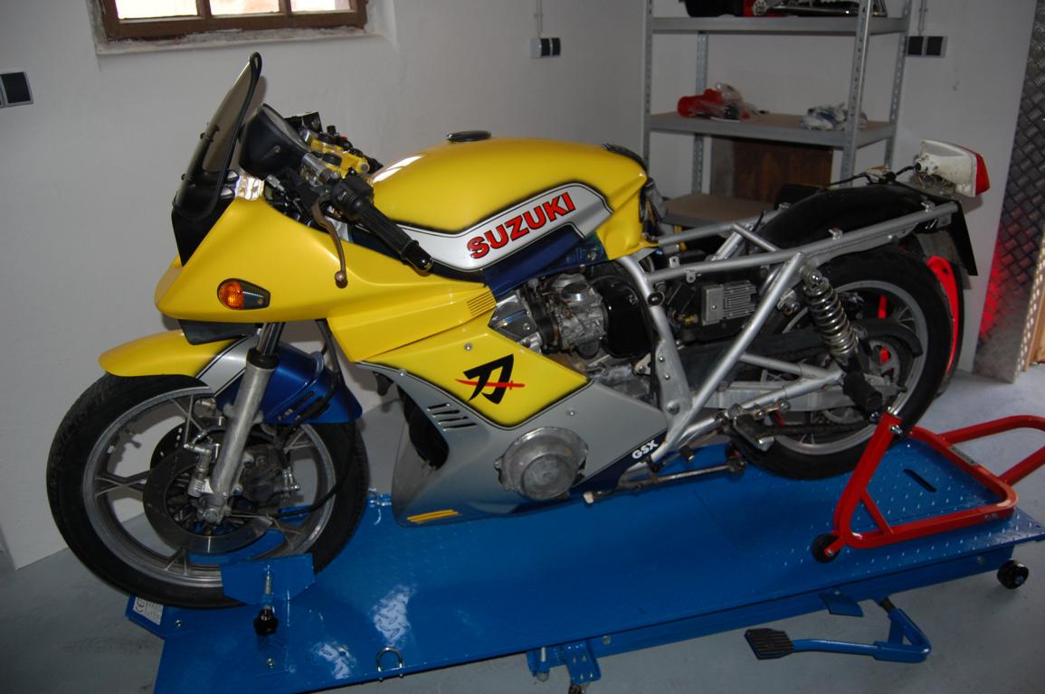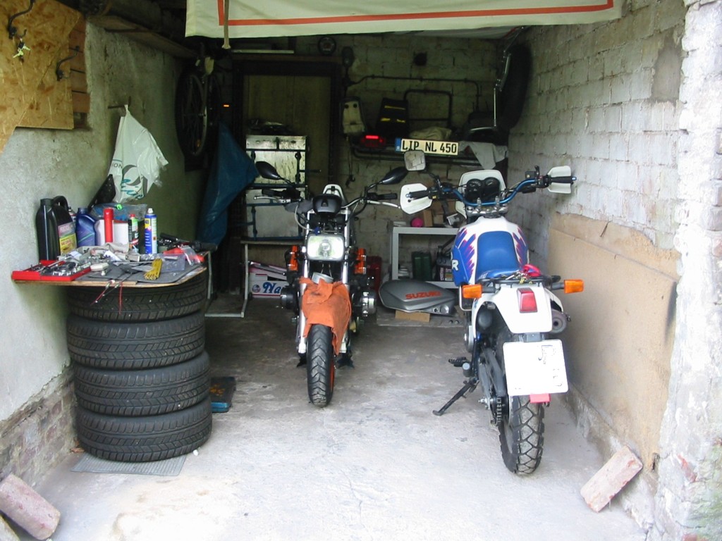 Meine "Werkstatt" zum jetzigen Zeitpunkt. Im Vordergrund rechts die Yamaha XJ650 einer Freundin, links meine GSX400F, daneben links