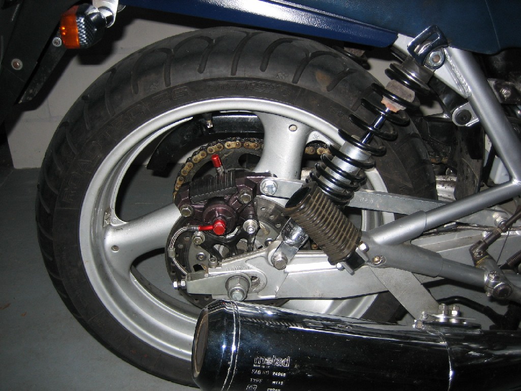 Leider hat mein Vorbesitzer hinten die Bremszange der Original-Katana mit der Bremsscheibe der GSX-R kombiniert...Ergebnis: Bremsleistung Mist.