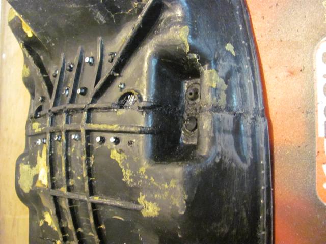 Oben und besonders an den Seiten habe ich die Naht mit den Lötkolben verbunden. Da die org. Sitzbank nach hinten schmaler wird ist hier ein Versatz entstanden. Darum erst mit dem Heissluftfön erwärmt, mit Klemmzangen fixiert und dann verlötet. Hier sieht man von oben auch das ich das org. Gummi von der Sitzbankauflage wieder verwende.