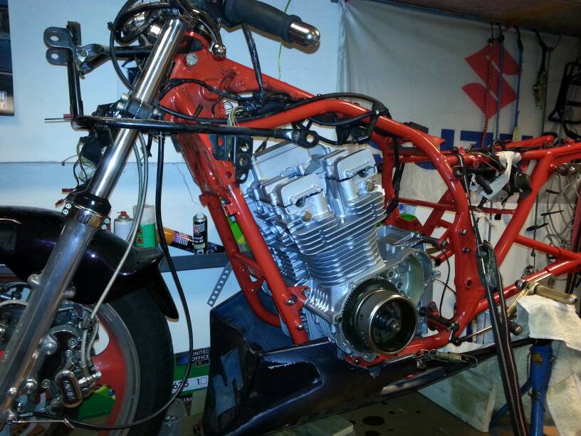 Habe das 18" Vorderrad der 400er Kati von `91 in die 11 er Gabel eingepasst, die Bremsscheiben der Selbigen mit neuen Floatern aufgearbeitet und die Bremssättel mit gefertigten Aufnahmen angearbeitet. Hinten musste die Hänsle um den Unterzug der K&J Schwinge geformt werden, dann ist das 5x18 Deget-Hinterrad mittig eingesetzt worden. Jetzt muss noch die Kettenflucht ausgearbeitet und die Bremsankerstrebe angefertigt werden.