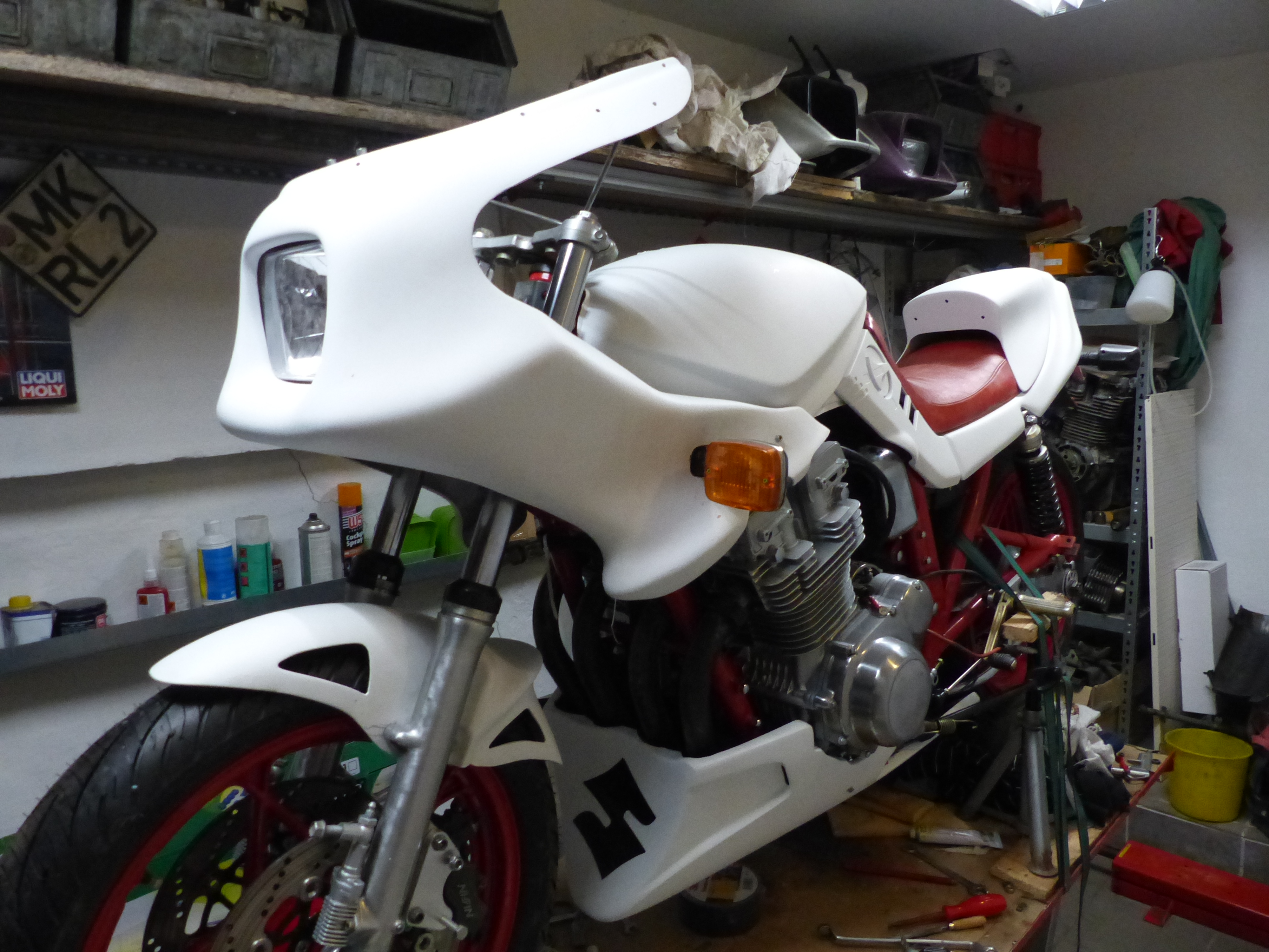Aber nach dem Radeinbau ging es erst einmal an die Lackteile, da ich nur einen langen Speer-Bugspoiler einer GSX-ES bekommen hatte, musste ich diesen erst einmal an die Kati anpassen - der ES-Spoiler hat etwas andere Aussparungen für den Motor! Und dann noch die sehr MIESE Fertigungsqualität - zum Kot.....!