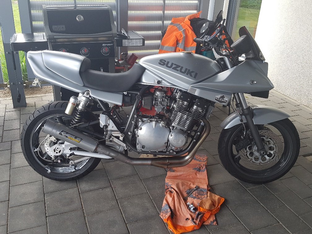 Nu ist also alles fertig. Nochmal eben auf XJR Dämpfer umgestellt, weil sonst die Kette nicht vernünftig über die Schwingenachse läuft. Ich habe die erste kurze Probefahrt gemacht und läuft ganz gut geradeaus und federt vernünftig. Nichts klappert und nichts schleift. Soweit so gut.