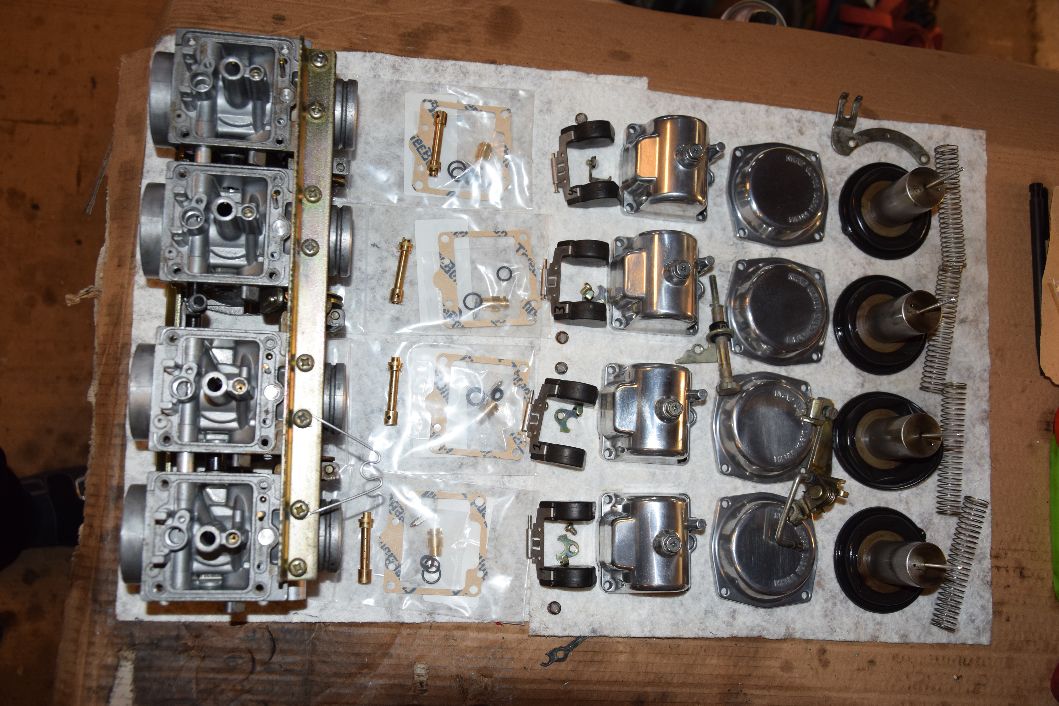 Ich habe mir vier Vergaserreperatursätze von Tourmax besorgt.Wie in deinem 1.Bild,wo du alles schön ordentlich hingelgt hast,hast du ja auch die Rep-Sätze liegen.Es befindet sich pro Packung vier Dichtungen und ein neues Nadelventil.