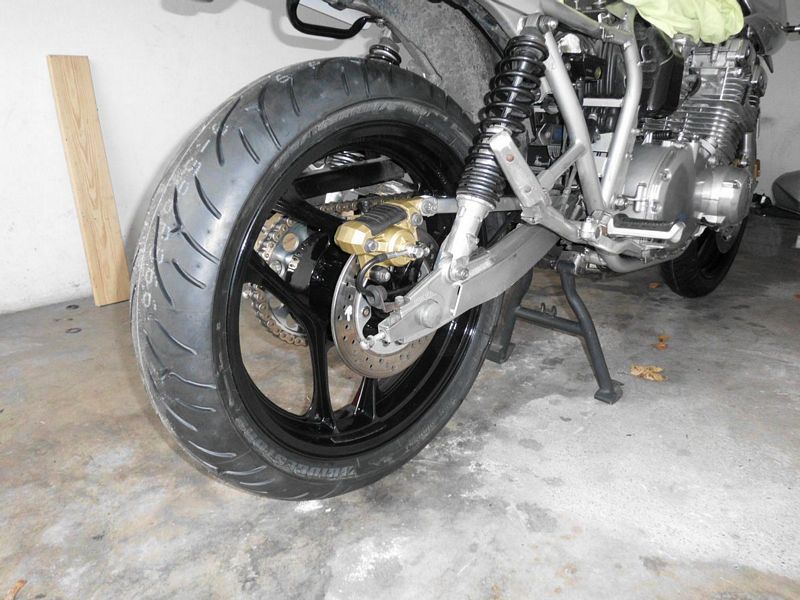 Hinten ist auch alles an seinem Platz. Die Katanabremsleitung passt an den GSX-F Sattel ... nur der Anschlussfitting musste etwas verdreht werden ...