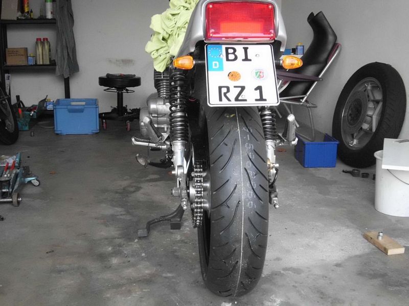 In den letzten Tagen hatte ich die Gabelrohre nochmal rausgezogen und geöffnet, denn ich habe dem Mopped noch ein paar neue Gabelfedern von Wirth gegönnt. Heute dann mal alles vorne endgültig zusammengebaut, das Mopped wieder auf die Reifen gelassen und die Verkleidung mal drangesteckt ... Hinten den alten Kettenschutz mal dran geschraubt. Da nichts schleift und überall ausreichend Luft ist, habe ich den gleich drangelassen ... Etwas neues gab es dann in dieser Woche auch noch. Und zwar das neue kleine Kennzeichen. Letztes Jahr war der Anblick der kleinen Kennzeichen für mich noch sehr ungewöhnlich. Aber mittlerweile finde ich das nett ...