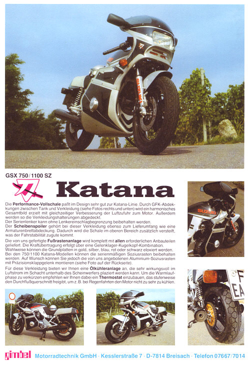 Neben dem sehr erfolgreichen Zubehörlieferant SPEER lieferte GIMBEL für die Katana verschiedene Verkleidungsteile in den 80er Jahren. Das Design aus dem Hause Speer konnte die Käuferschicht deutlich mehr überzeugen. Daher wurde eine große Anzahl an Katana im Rahmen verkürzt.