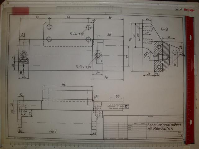 Dann hab ich meine lange verschütteten Kenntnisse (und Werkzeuge) aus meiner Zeit als Maschinenbautechniker rausgekramt und mich an eine Zeichnung für die obere Federbeinaufnahme gesetzt.
