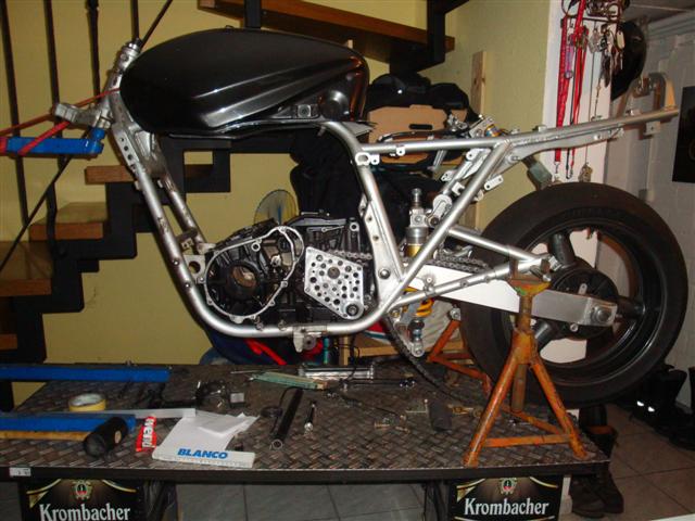 Bitte nicht kritiklos übernehmen, sondern bedenken, daß es sich um eine Einzelanfertigung unter besonderen "Rahmen-"Bedingungen handelt. Das Federbein der SRAD ist deutlich länger als das anderer Mopeds, die gerne mal für sowas genommen werden. Außerdem habe ich nicht die originalen Umlenkhebel verwendet, drittens habe ich den Motor um 10mm höher eingebaut, um ein bißchen mehr Schräglagenfreiheit zu bekommen.