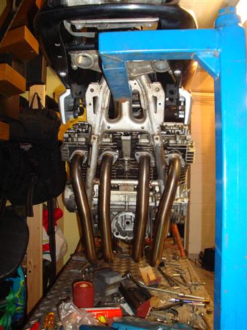 Fazit: Krümmeranlage stößt an das Rahmenquerrohr an und ist nur mit etwas größerem Aufwand, d.h. Umschweißarbeiten zu verwenden. Hab ich aber keine Lust zu gehabt, außerdem ist die schicke neue Tröte dazu eigentlich zu schade.