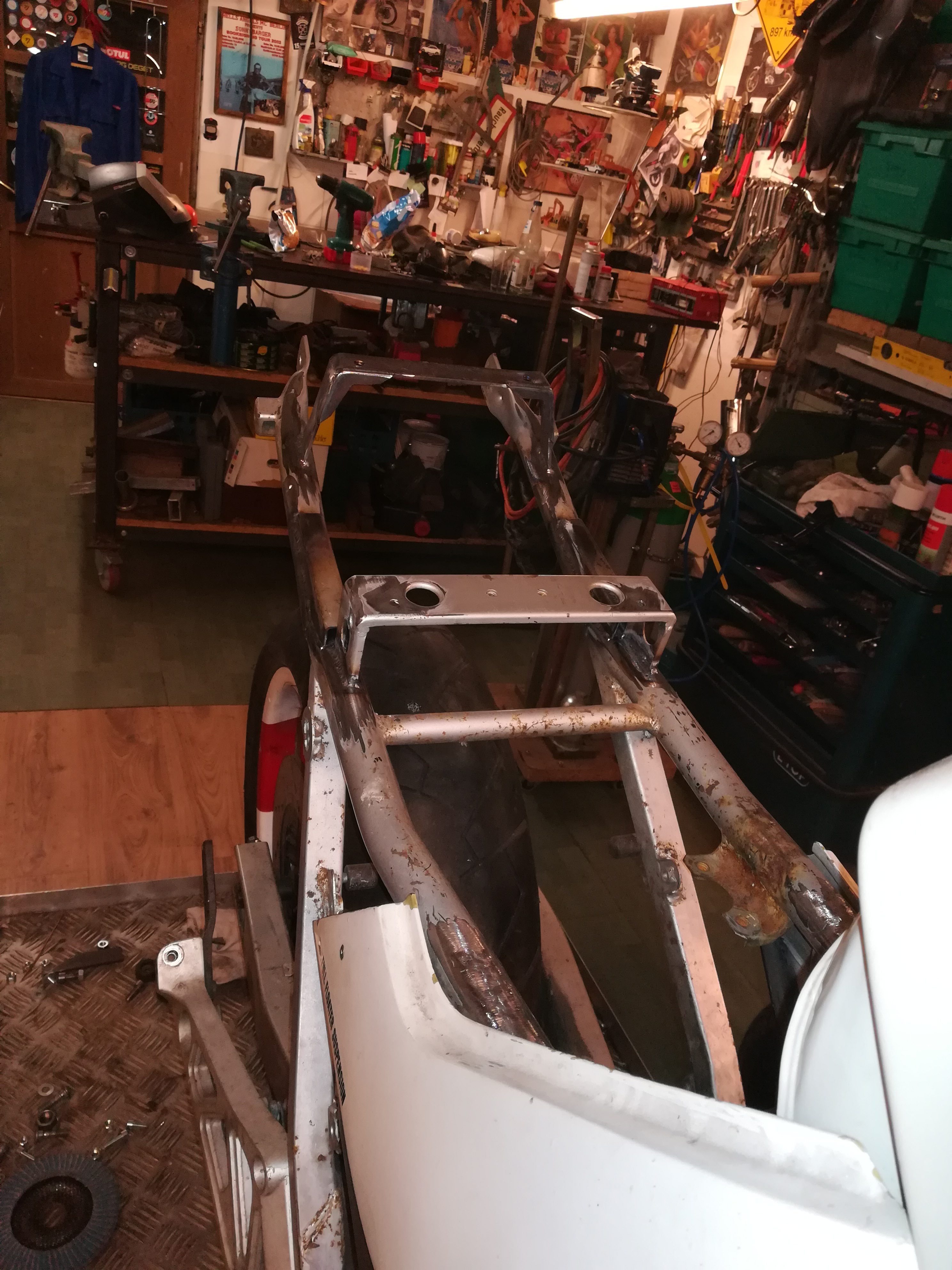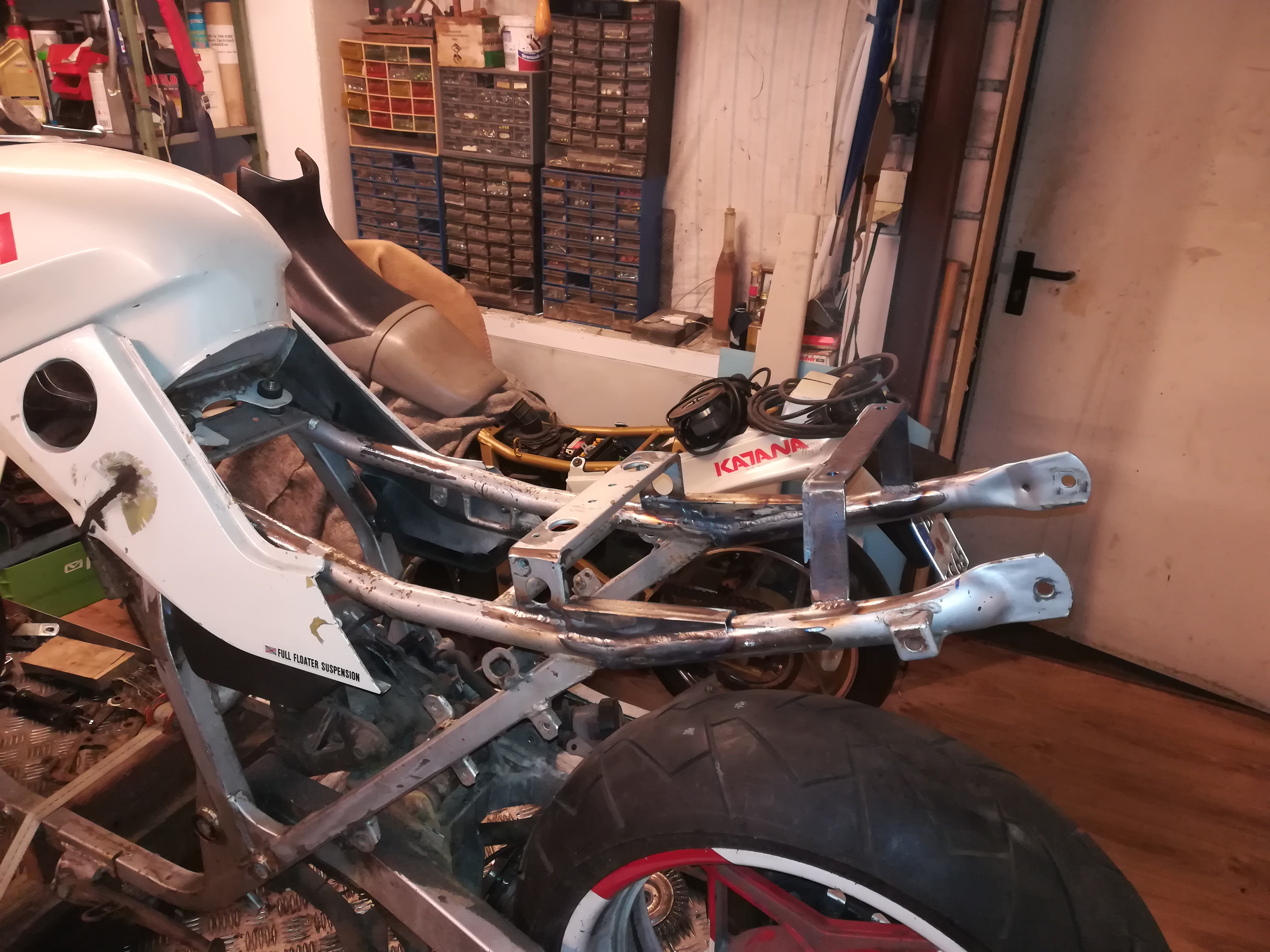 Ich weiß gar nicht, was die die sich bei Gimbel gedacht haben. Jetzt hatte ich schon gedacht, er wäre von einem anderen Modell. Steht aber 750 bzw 1100 Katana drinne. Na jedenfalls ist soweit ausgeartet, das ich die Endrohre abgetrennt habe, die Verkleidung halb zerstört habe, mit Holzkeile ausgerichtet habe, das es halbwegs passend ist. Im Endeffekt war ich bei meinem Seelentröster REWE, und hab erstmal Bier gekauft, um mich zu beruhigen. Und kann mir dann schon die nächste Idee. Ich wollte ja schon immer ein Wechselhöcker mit integrierter Sitzbank bauen. Und da die Flex schon draußen war, ran an den Rahmen. Fragt mich nicht über das ganze warum, weshalb wieso, ob ich Drogen nehme, wieviel und welche.was sagt der TÜV oder die Rennleitung. Wissenschaftliche Erklärung mit 4Buchstaben, " IS SO". na jedenfalls kann ich jetzt mit 2 Sitzbänken fahren, wechselseitig natürlich. Bin noch am überlegen, ob ich vielleicht noch noch Originale Sitzbank dazu nehme. So, hier die ersten Bilder