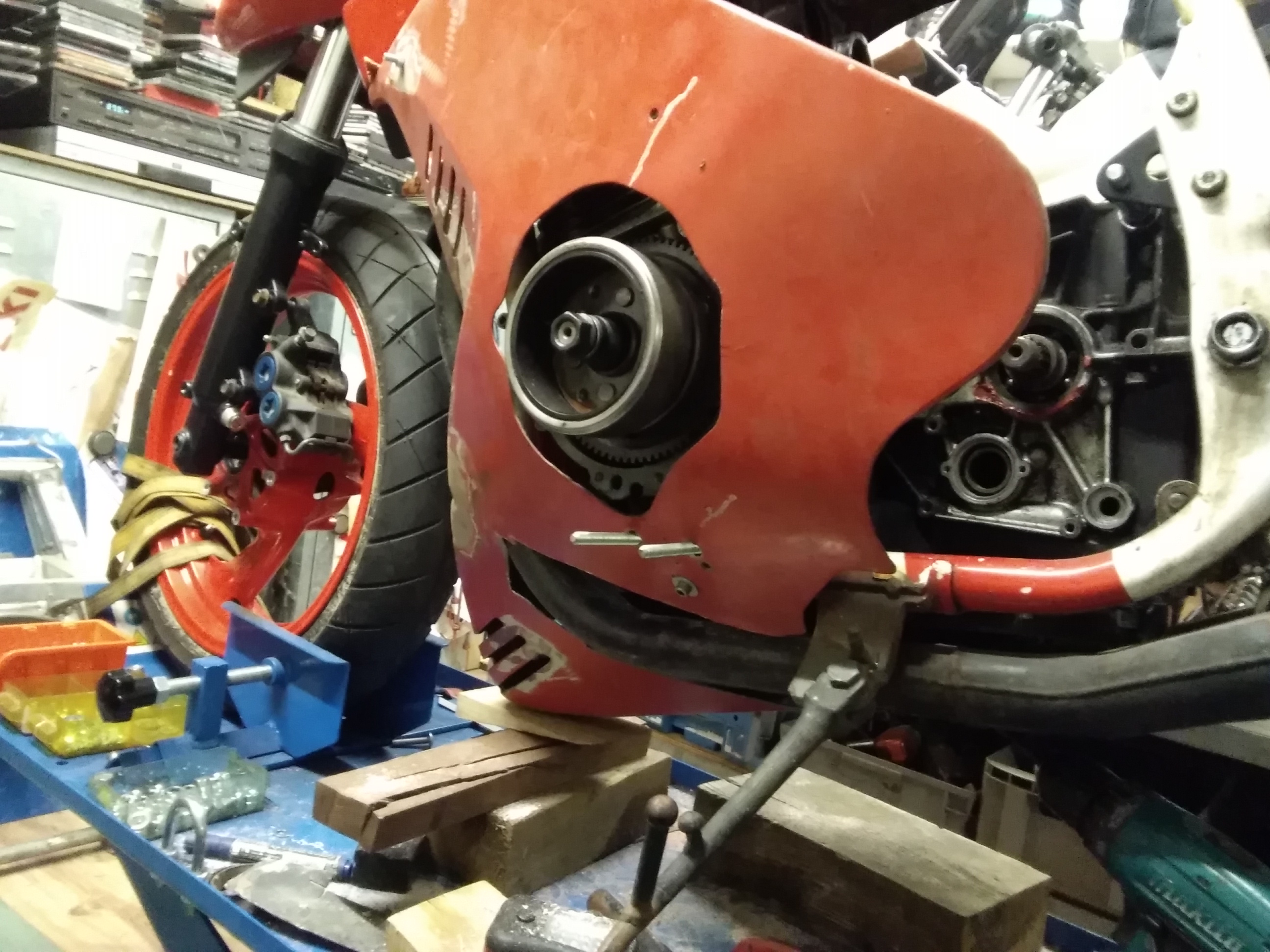 Jetzt komm ich mal zu meinem Sorgenkind Nr 1. Einige werden sich noch an meine ro/we Kati erinnern. Steht ja jetzt auch schon 3-4 Jahre auf der Rampe. Nun ging es weiter. Gabel von der Yamaha YZF 1000 R mit Vorderradfelge, fehlen nur die Bremsscheiben, Sättel sind von der R1. Dann hab ich endlich den Spoiler von Gimbel gekauft. So, ranhalten und festschrauben. Nix da, passt vorn und hinten nicht. Ständig war mein Edelstahlkrümmer im Weg. Okay, Krümmer ab und Originalen angeschraubt. Nächstes Problem, um dn Spoiler zu montieren, muss man das Motorrad ein halber Meter in die Luft heben, um das Dingen zu zu kriegen. ALPTRAUM