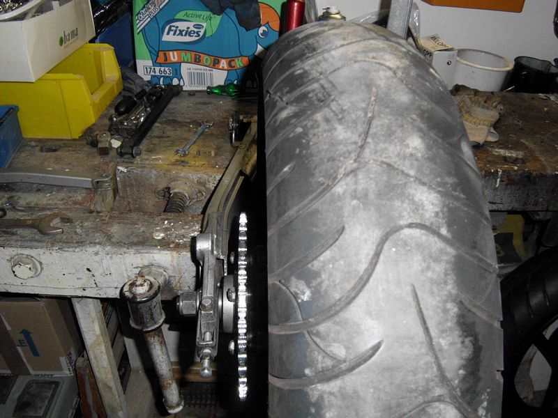 Ich hatte bei mir im Keller eine alte Katanaschwinge auf die Hobelbank gespannt und darin das Rad mit neuen Hülsen ausdistanziert. Das war zwar die 3,5-Zoll Knickerfelge, aber die ist von der Nabe her gleich mit der 4-Zoll Felge. Da fiel mir auch schon auf, dass das Kettenrad sehr weit nach außen kommt. Daraufhin habe ich den Kettenradträger um 7mm abgedreht (siehe auch den Beitrag auf vorherigen Seite) ... das wird schon, hoffe ich