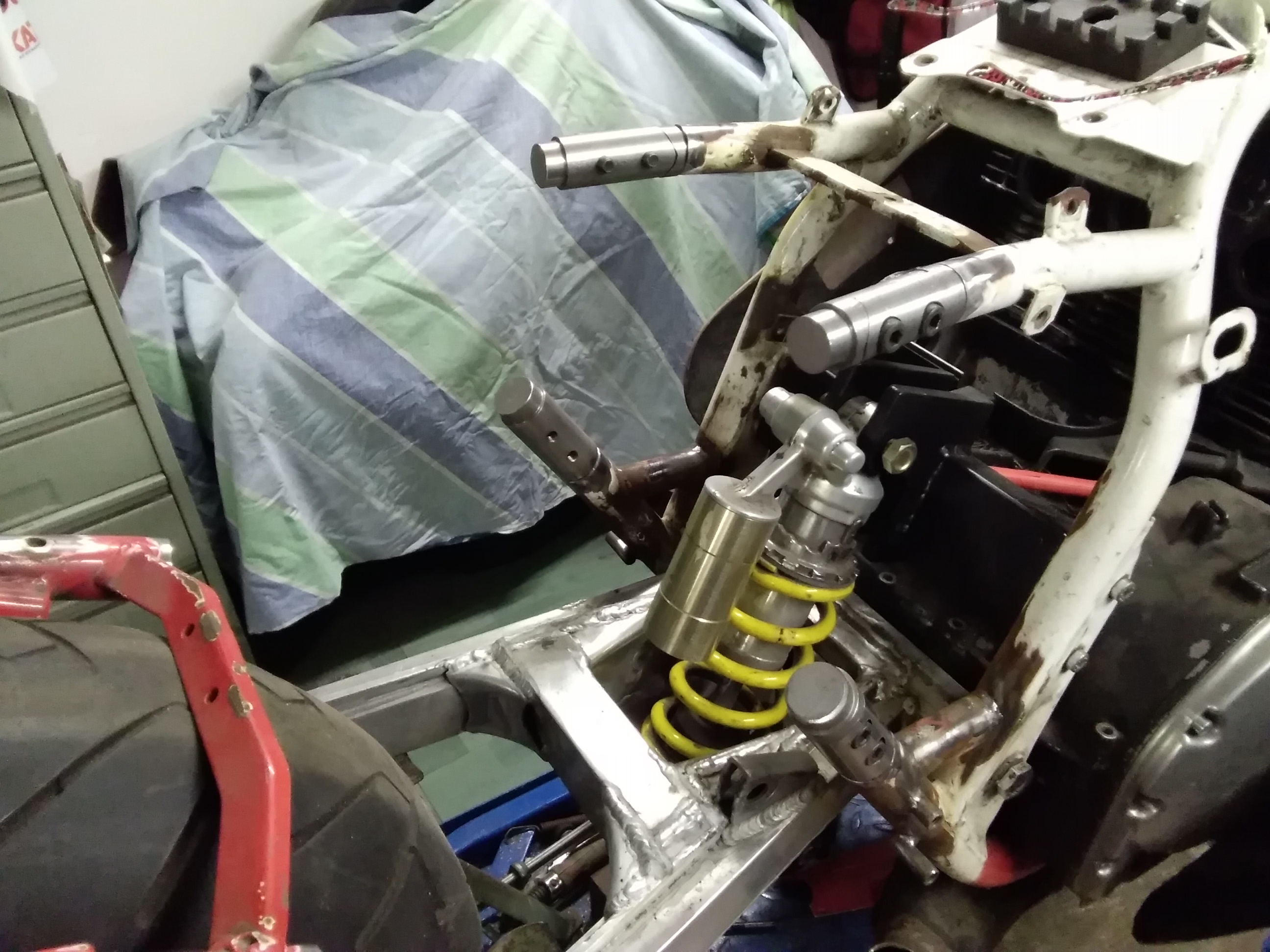 Trotz der vielen Arbeit ist mal etwas Zeit gewesen, um an der rot /weißen weiter zu bauen. Frontend steht, Telegabel von der Yamaha YZF 1000 R eingebaut, Bremsscheiben von der R1.. Passt hervorragend.
