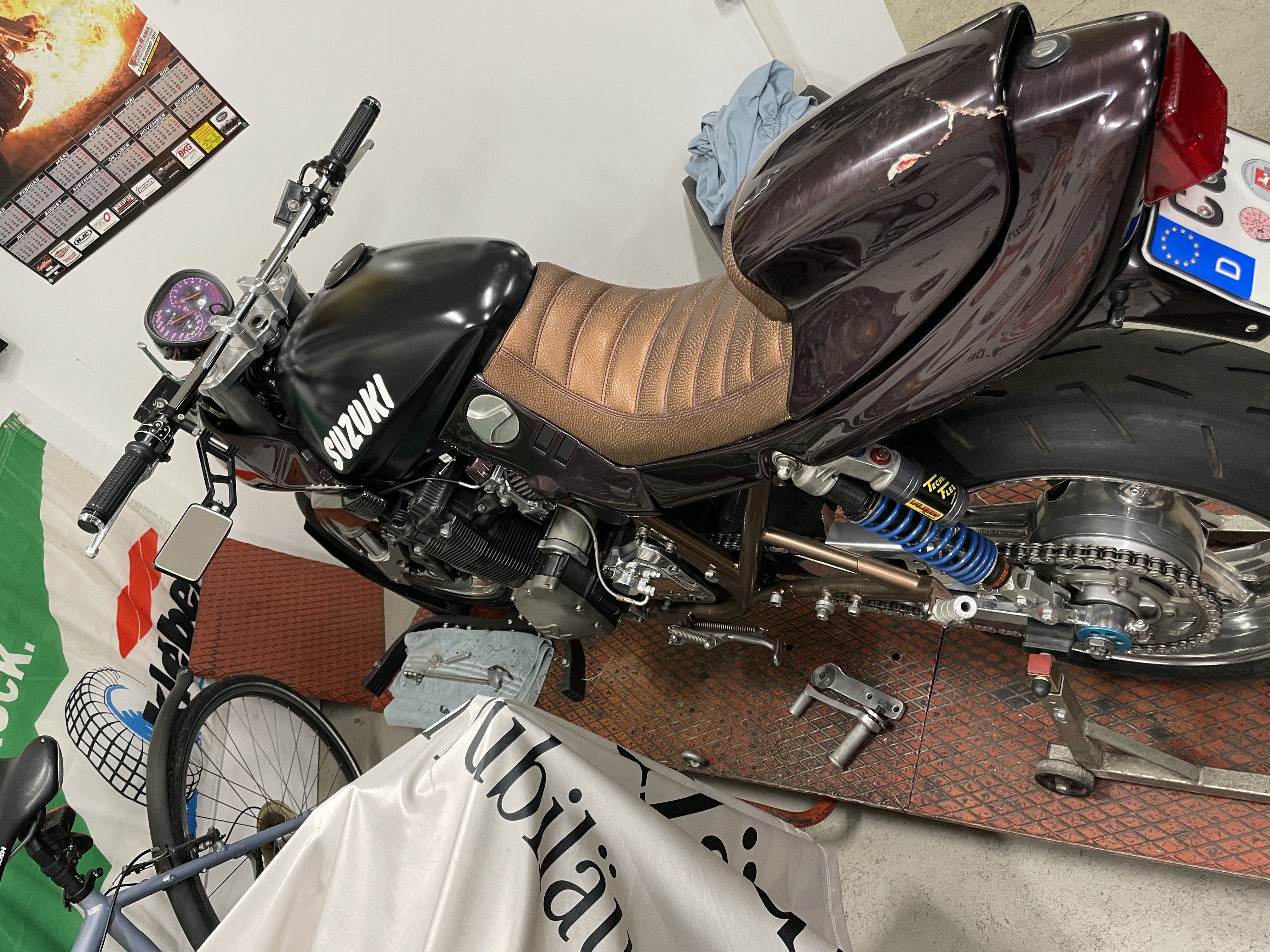die blauen Flecken sind verheilt und die Katana kommt auch wieder Stück für Stück zusammen, neuer Lenker mit Strippen für die Taster ist wieder dran, Hebel, Spiegel, Blinker ersetzt. Beim Tank wollt ich eigentlich ausbeulen- habe aber ein unschlagbares Angebot bei Kleinanzeigen gefunden und musste zuschlagen - diese Saison wird wohl bunt zusammengewürfelt gefahren und im nächsten Winter kommt alles auseinander um neue Farbe zu bekommen.