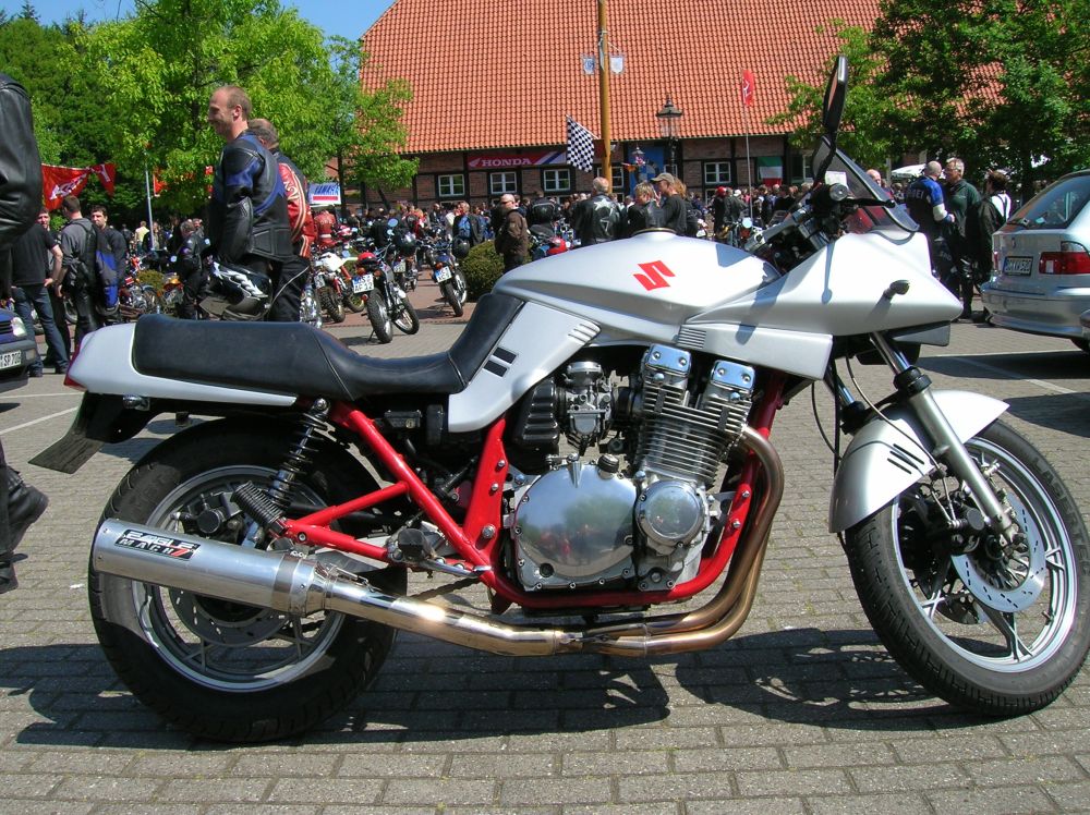 Ok, ok. Ich komme aus dem Münsterland. Mein Moped habe ich 1993 aus Schrott zusammen gebastelt. Ich hatte eine Original-Katana mit Rahmenschaden, einen Gebrauchtrahmen und zwei defekte Motoren. Das Ergebnis habe ich angehängt.