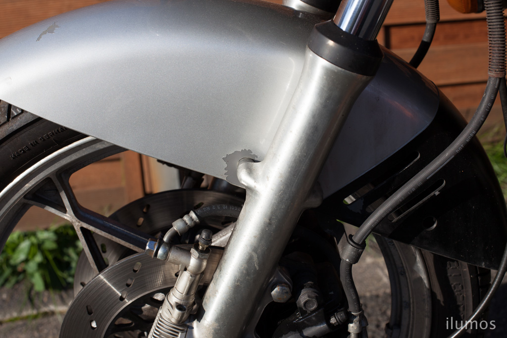 Das Schutzblech vorne hat etliche Macken und Lackplatzer.