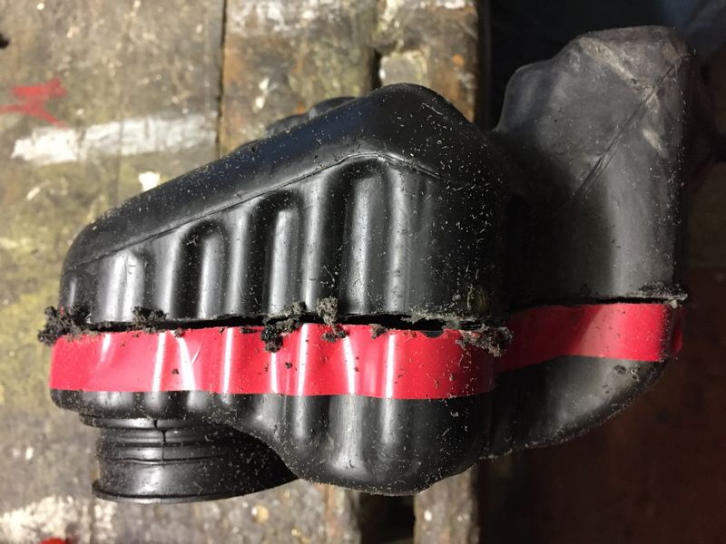 Zuerst mal eine Möglichkeit gesucht, eine vernünftige Trennstelle zu finden, um so ca 15mm aus dem Gehäuse rauszuschneiden und dass das auch nachher wieder passend und ohne größeren Versatz zusammen geht. Die Trennstelle dann mit Klebeband markiert und mal den Dremel angestetzt ... geht ganz gut ... Nachdem ich einmal rimgsrum war, konnte ich die beiden Teile auseinandernehmen ... Bei den beiden äußeren inneren Stutzengummi habe ich auch so 15mm weggeschnitten, da die Gummis ansonsten am hinteren Gehäuseteil anliegen würden ... Die Teile passen auch ganz gut wieder zusammen ...