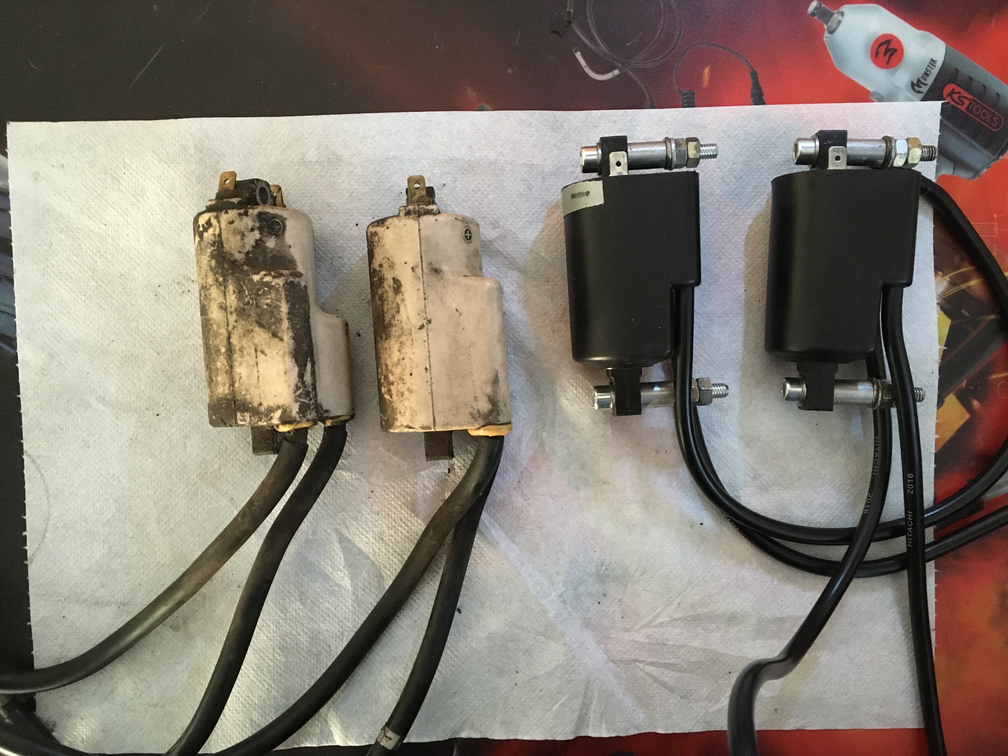 hier mal ein Bild von den 1200 Bandit Spulen. Wie der Hochsauerländer schon sagte passen sie auf die originalen Halterungen. Ich musste sie nur etwas höher verbauen (längere Schrauben). Leider stand keine Nr. mehr drauf, ich denke aber das die von den alten Luft/Ölgekühlten alle gleich sind.