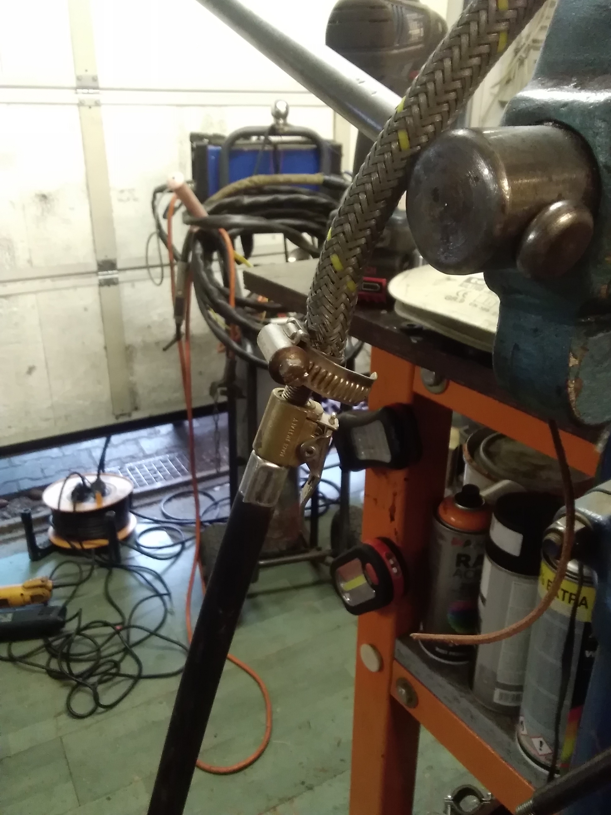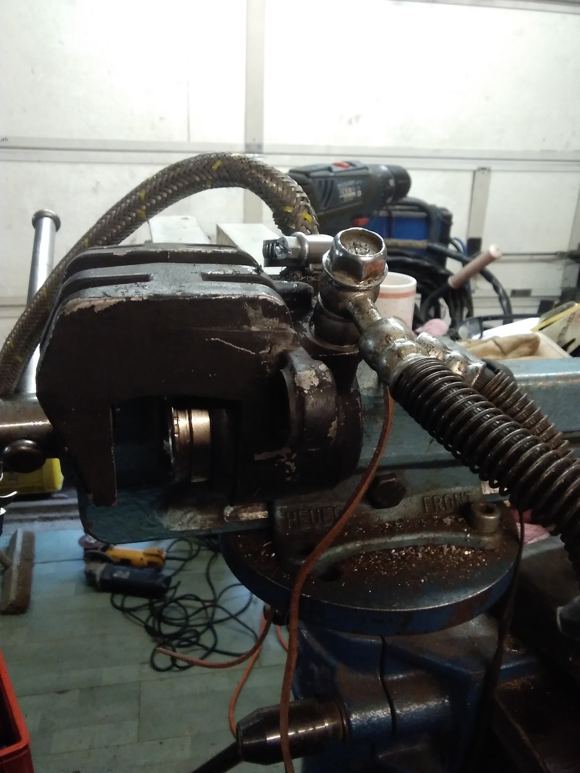 Hab jetzt beschlossen, meine Bremssättel aufzuhübschen. Aber schon beim Kolben raus ziehen, bin ich gescheitert. Alles versottet, in meinem Bestand, wollte ja nicht die fahrenden Kisten auseinander nehmen. Luft ist des Rätsels Lösung. Also Bremssattel in den Schraubstock gespannt, den Zugang blind gemacht, und Entlüftungsschraube geöffnet. Hab dann ein stahlummantelten Schlauch auf die Entlüftungsschraube gesetzt und verschraubt. Dann hab ich von einem alten Schlauch das Ventil rausgeschnitten, und auf der anderen Seite vom Schlauch eingesetzt. So jetzt Luft vom Kompressor ran. Fertig. Falls das jemand nach bauen will, etwas Vorsicht walten lassen. Handschuhe und Brille sind ratsam, falls noch Bremsflüssigkeit vorhanden ist. Und ist zu Luft da, fliegt der Kolben wie ein Geschoss