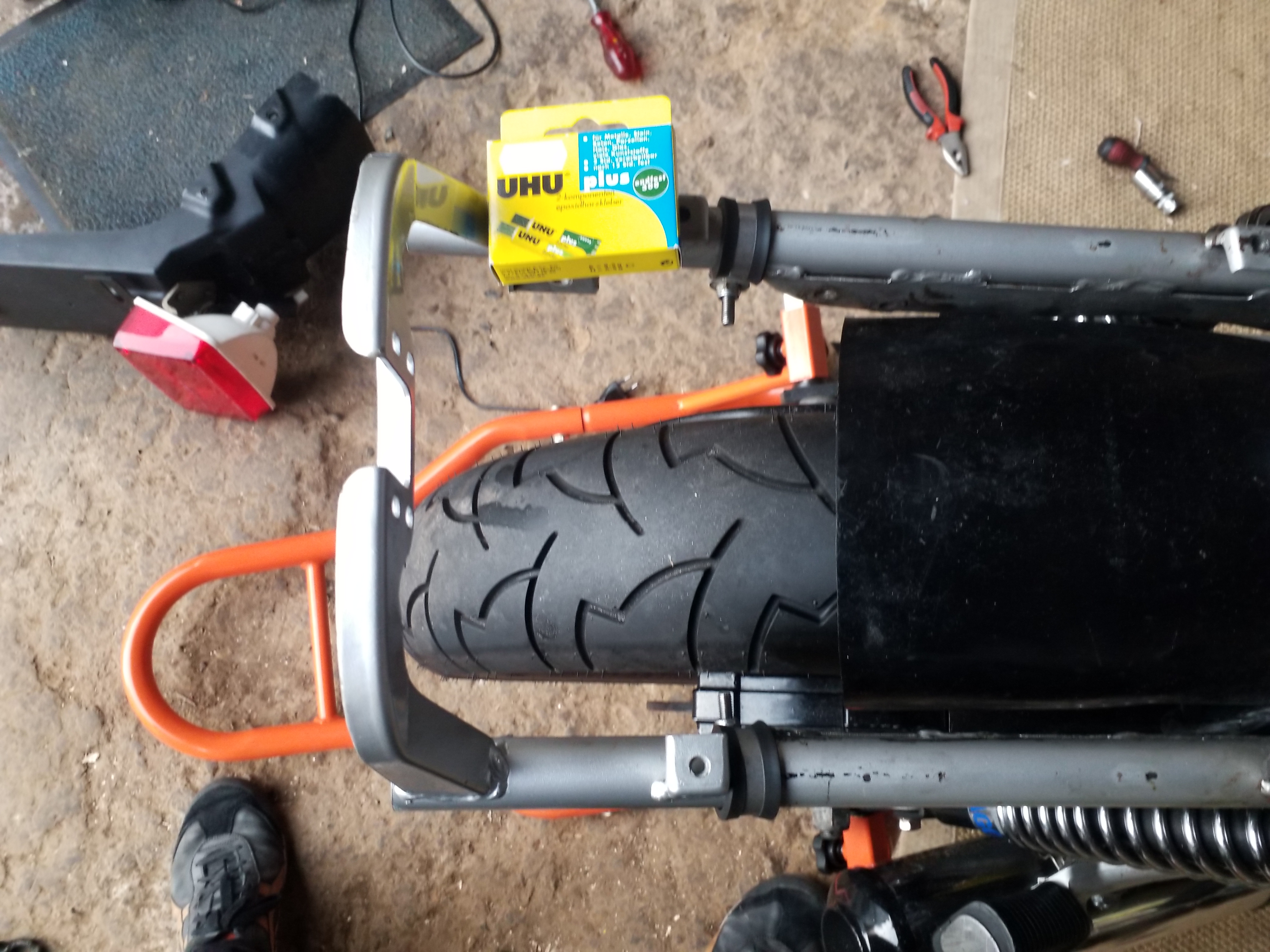 Also, ich habe lieber 2 passende V2A- Rohre in den Rahmen geschoben und mit Schellen verbunden. Da ich das hintere Ende mit den Rohren verklebt habe, bleibt alles rückbaufähig. und ist durch die Verschraubung mit dem Haltebügel später bombenfest.