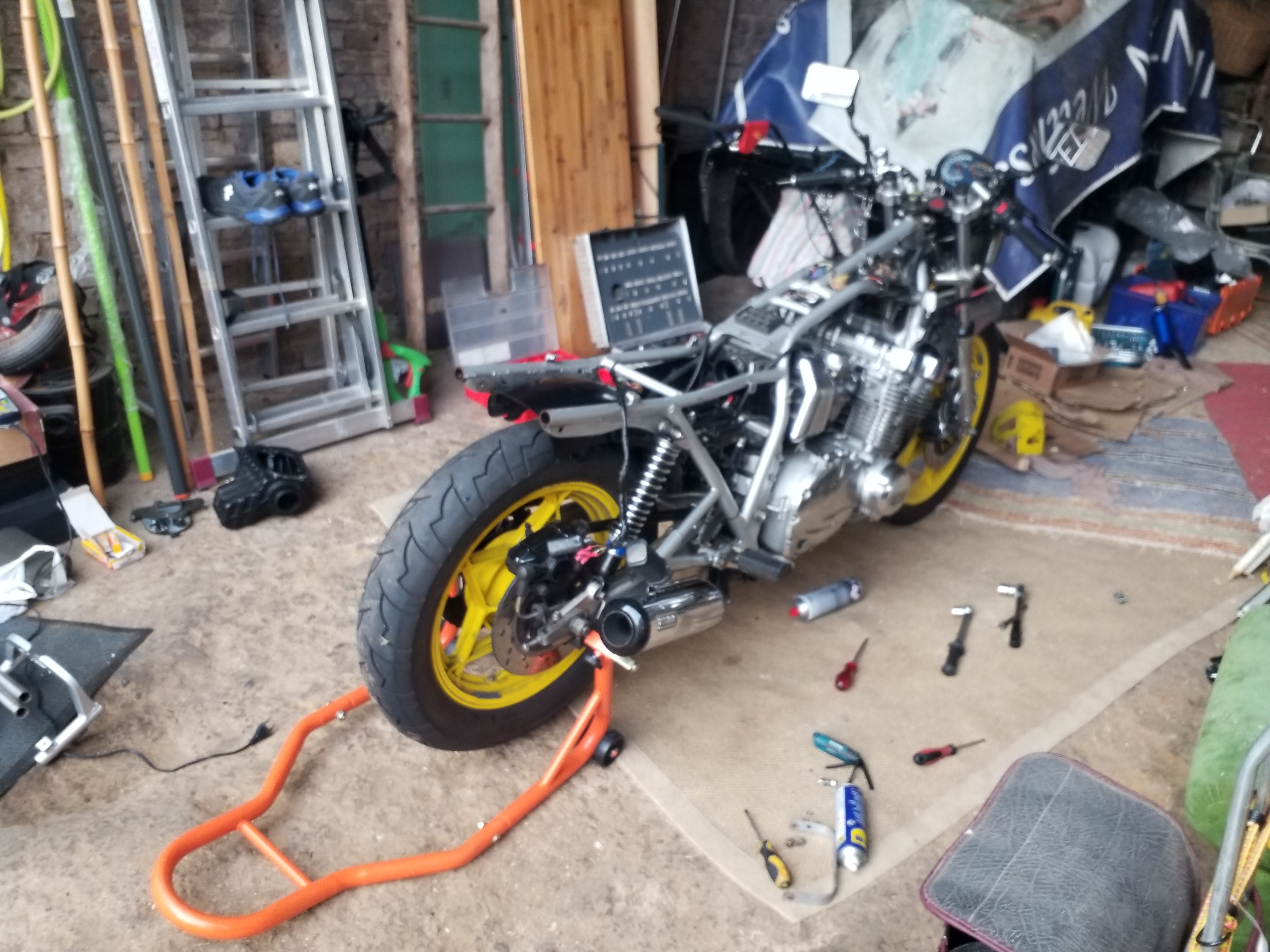 das Speer-und Gimbelmaterial ist jetzt runter, wenn jemand Interesse daran hat, kann sich gerne melden. Schön gelbe Originalfelgen sind jetzt auch über. Der Marshall-Auspuff, bin noch nicht sicher, ob er bleibt, die Originalanlage und den Hauptständer habe ich ja auch, ebenso die Originalfederbeine. Hagon-Federbeine sind jetzt verbaut, aber fast so alt, wie die originalen.